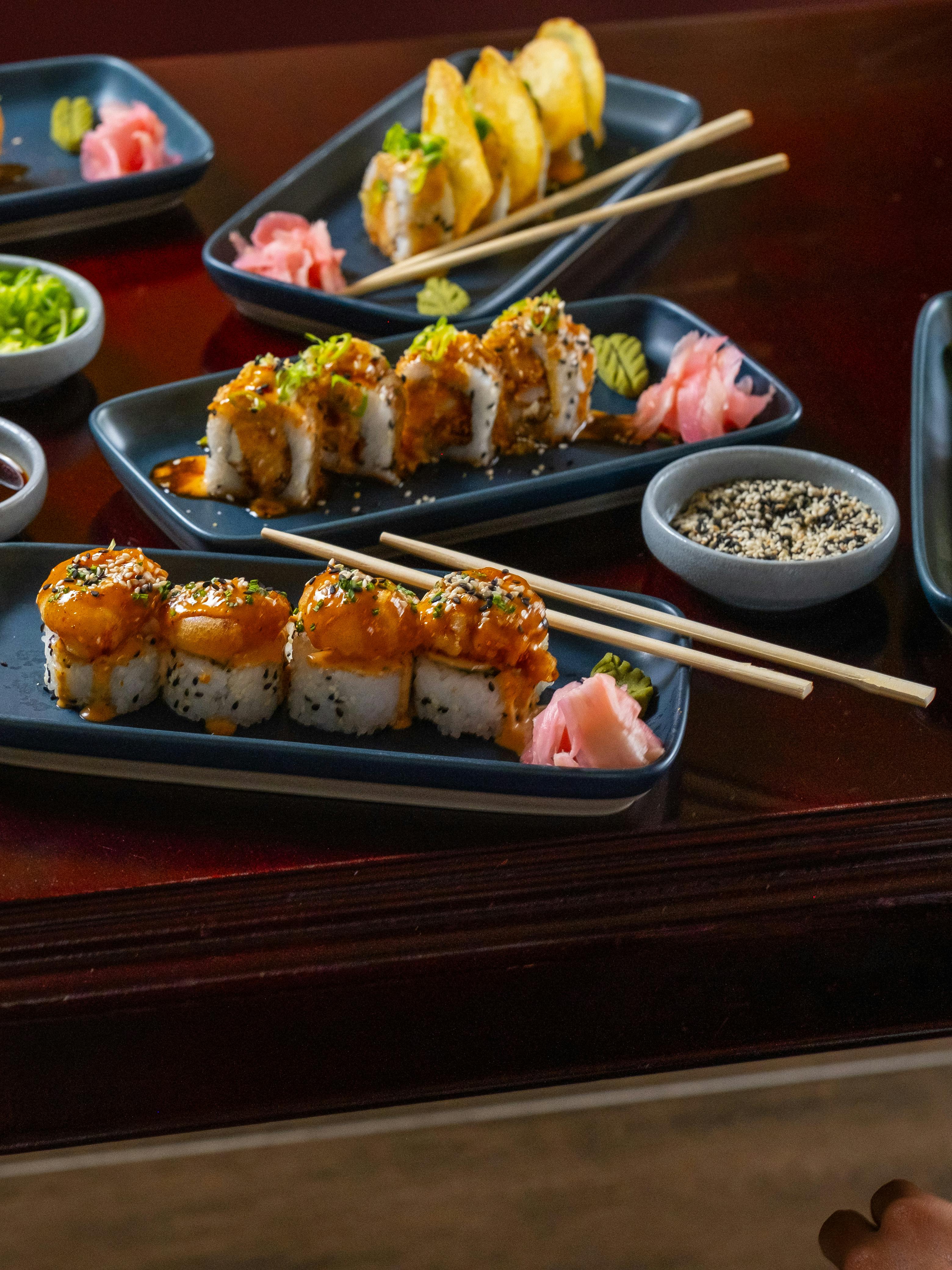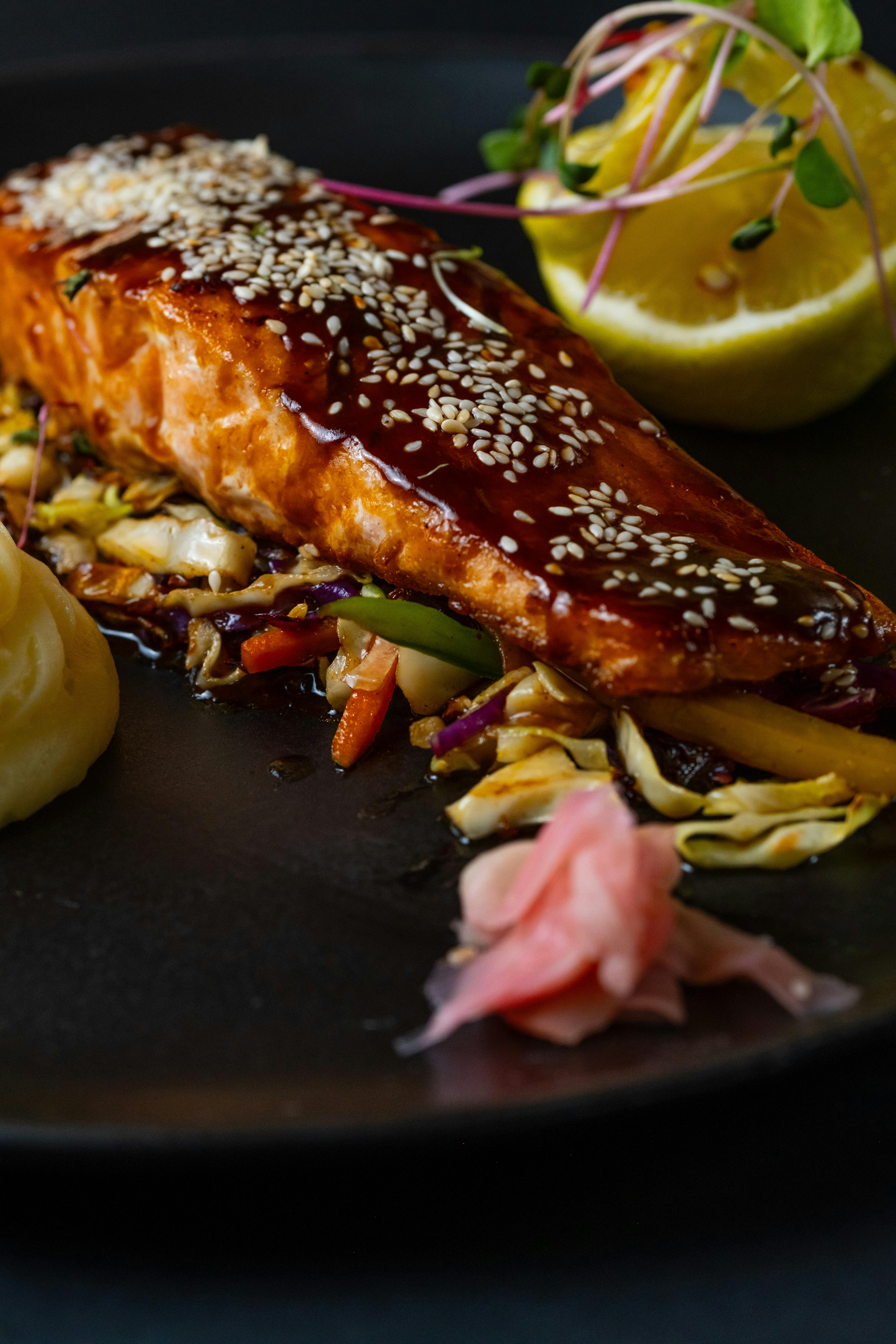 Seared Norwegian Salmon Served With Julienne Veg, Pickled Ginger And Teriyaki Sauce
