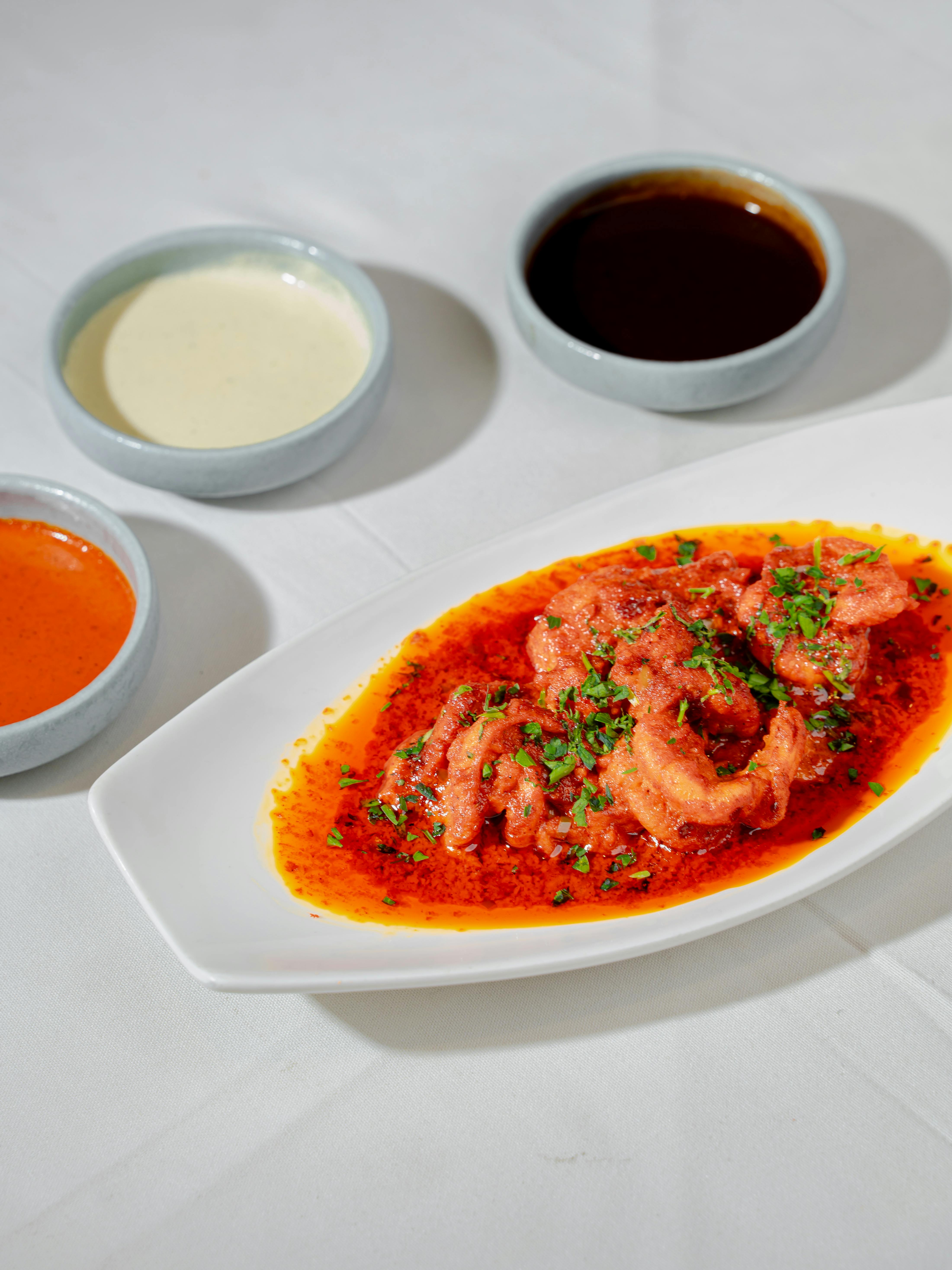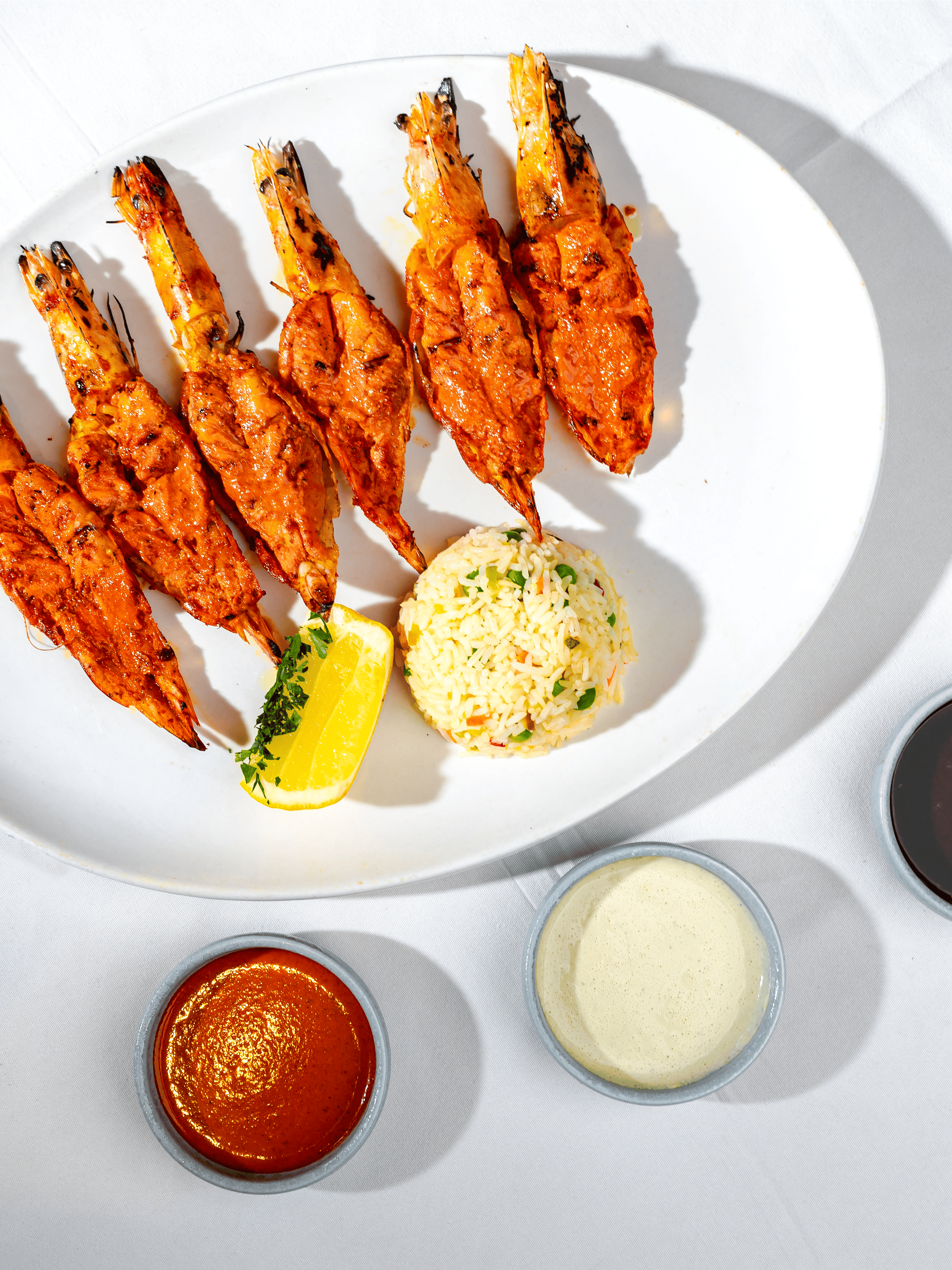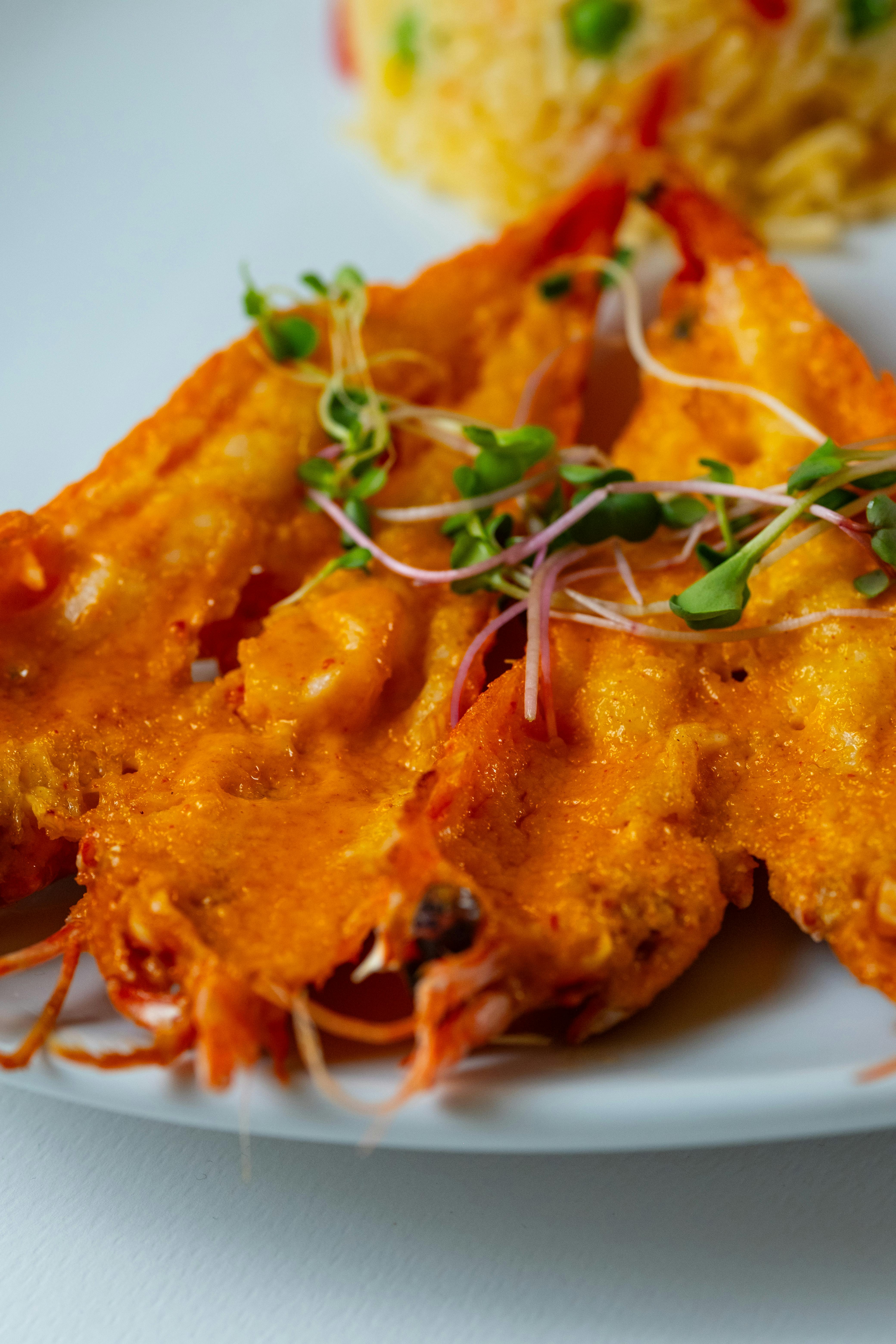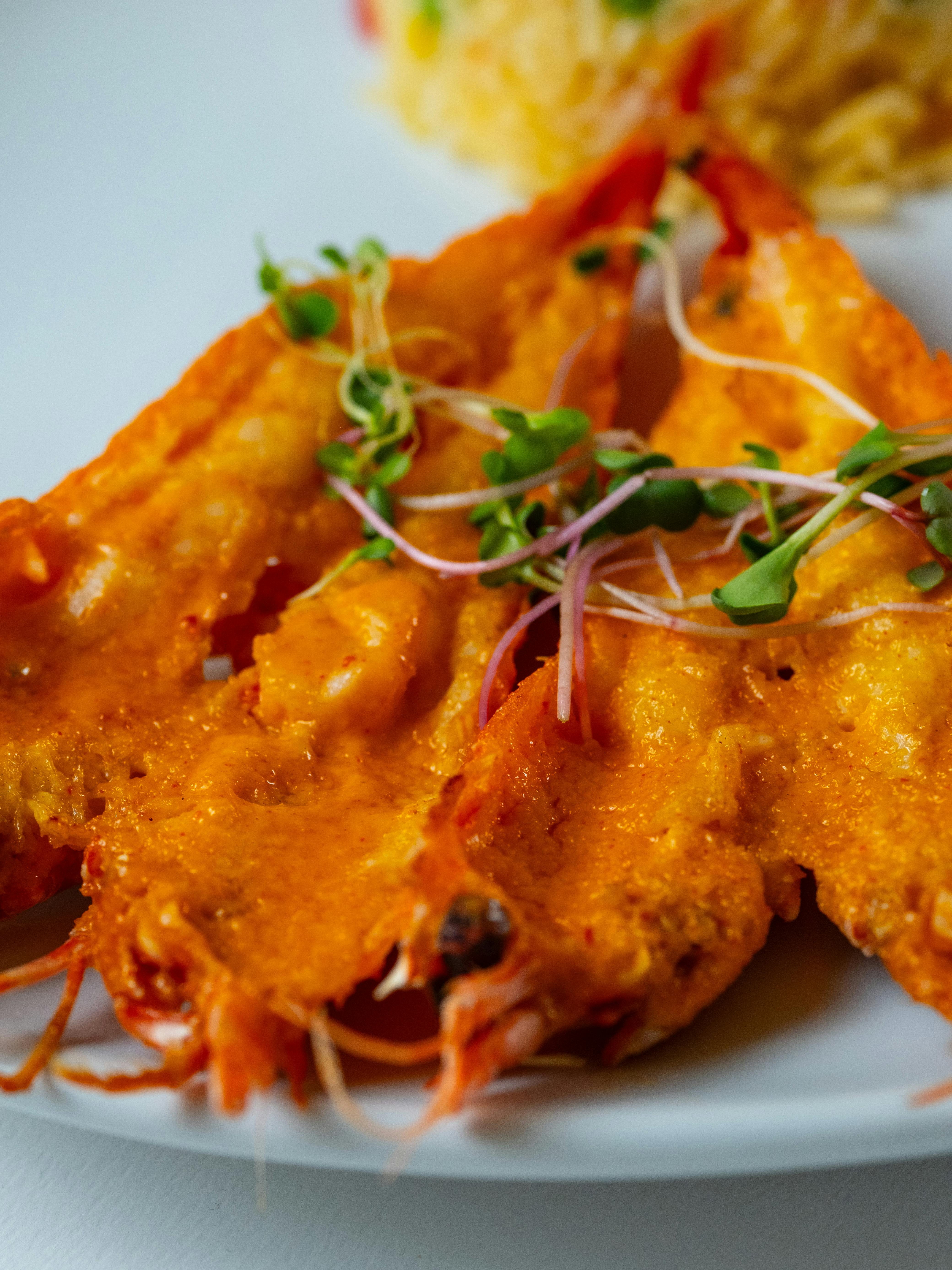 10 Pan-Fried Prawns Topped With Our Chilli Cilantro Sauce And Fresh Micro Greens Served With Rice.