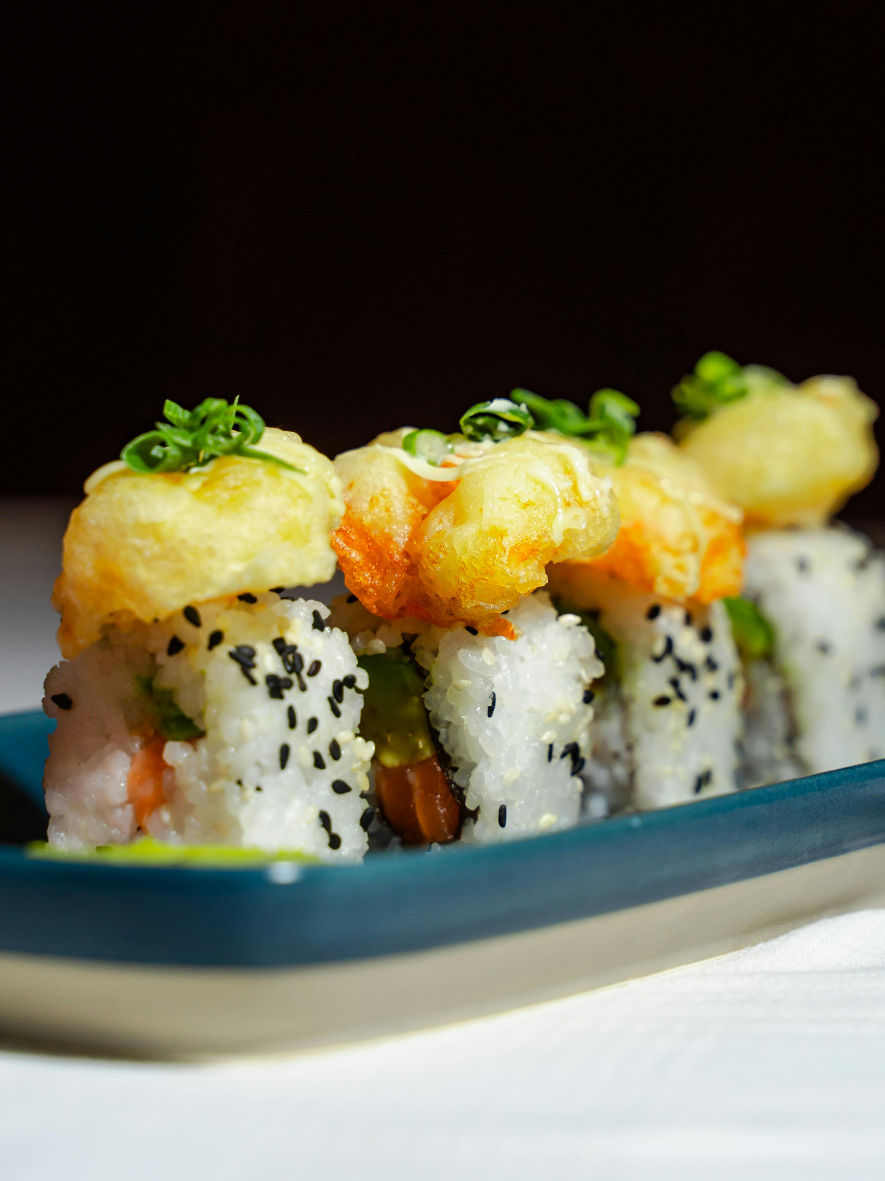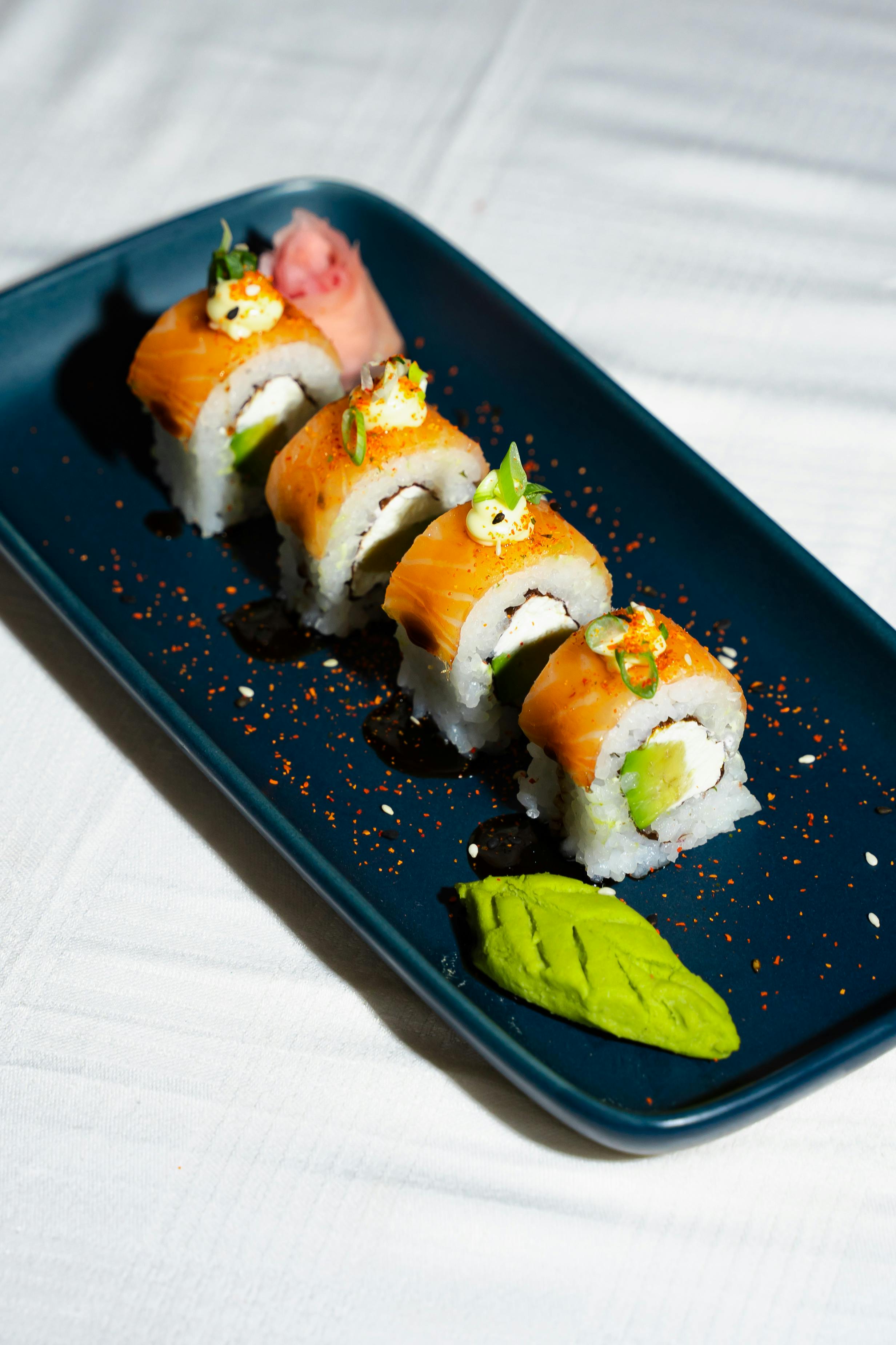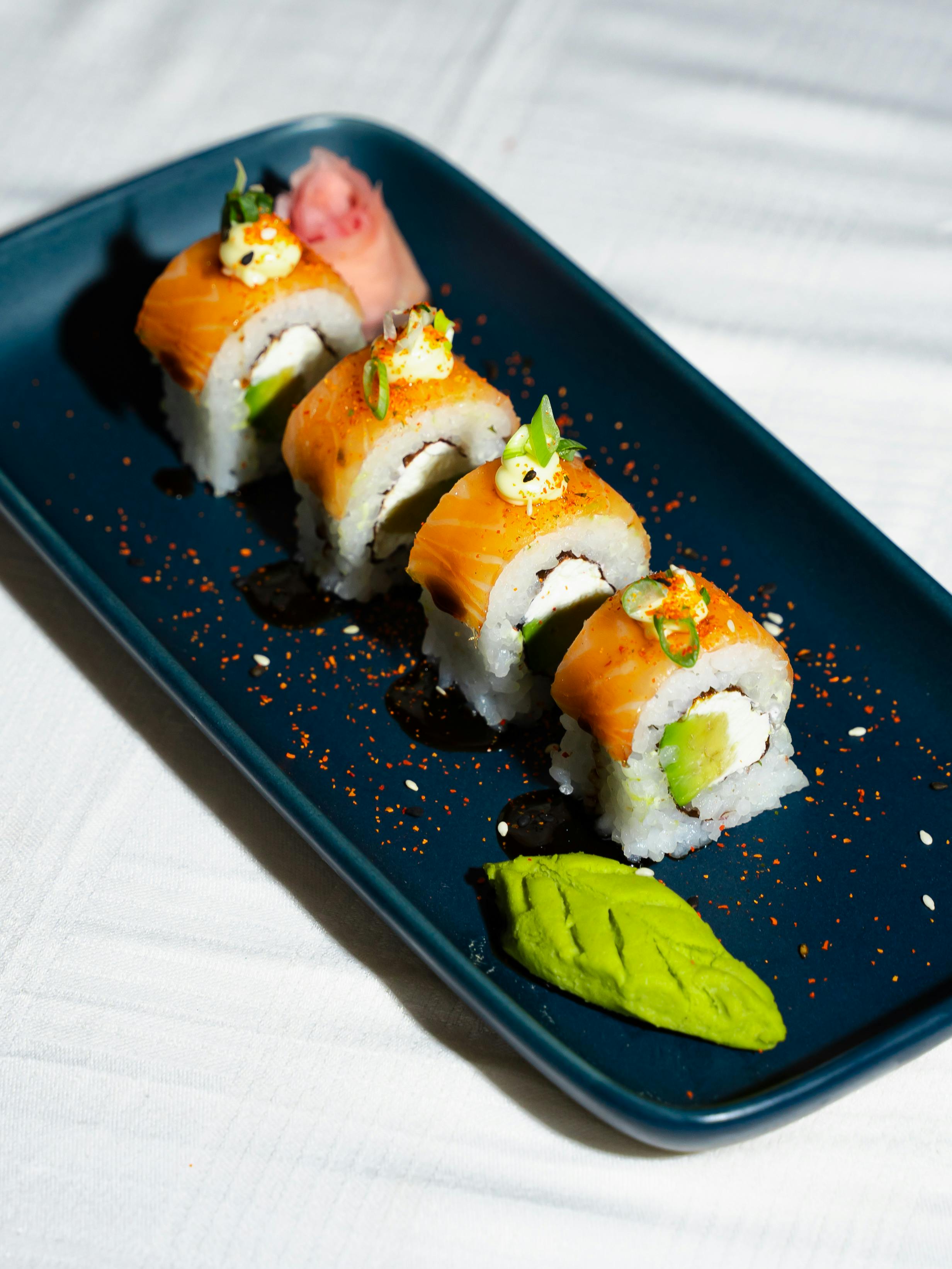 Cream Cheese Smoked Salmon And Avocado Roll Dressed With Spring Onion, Japanese Mayo, Seven Spices And Teriyaki.