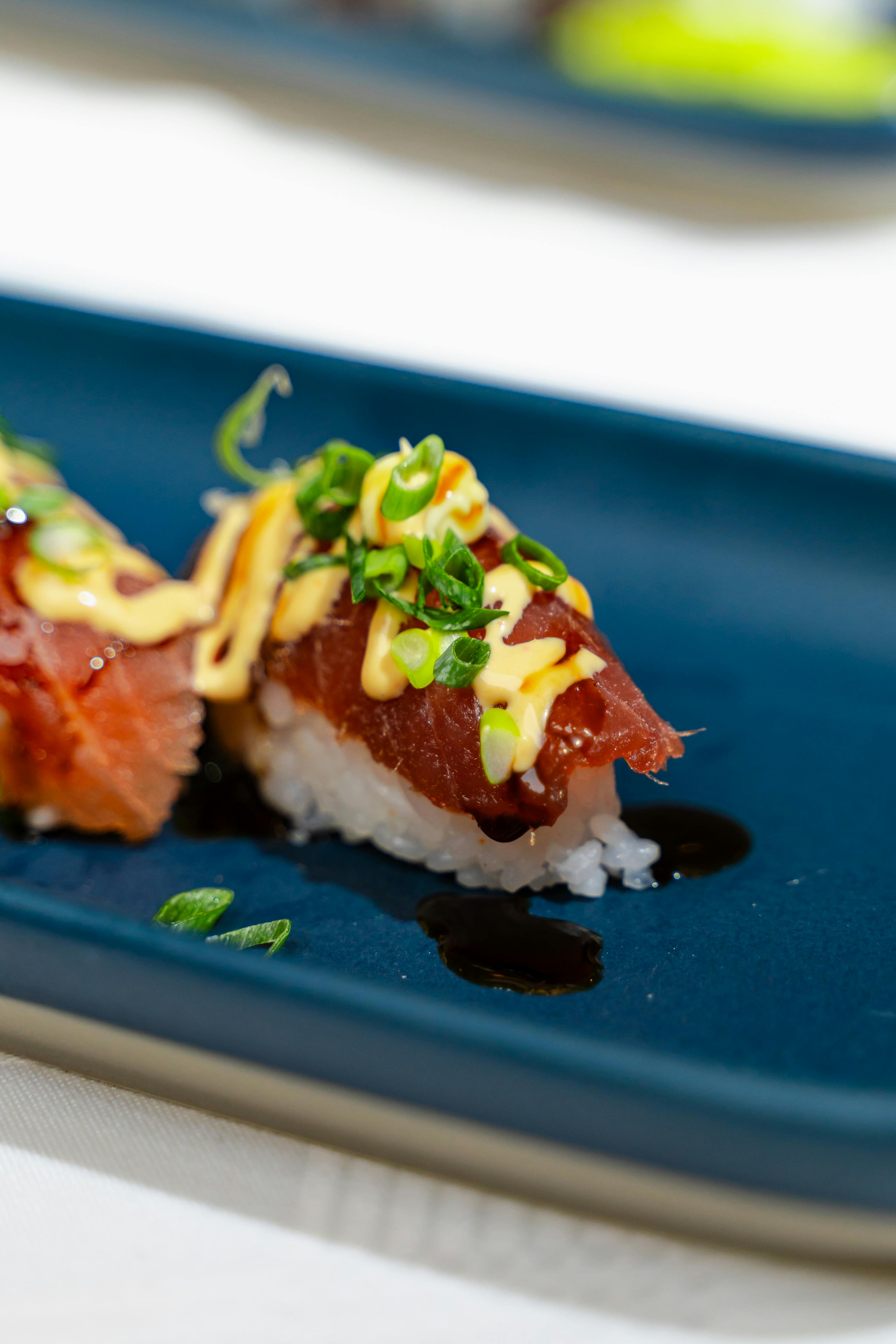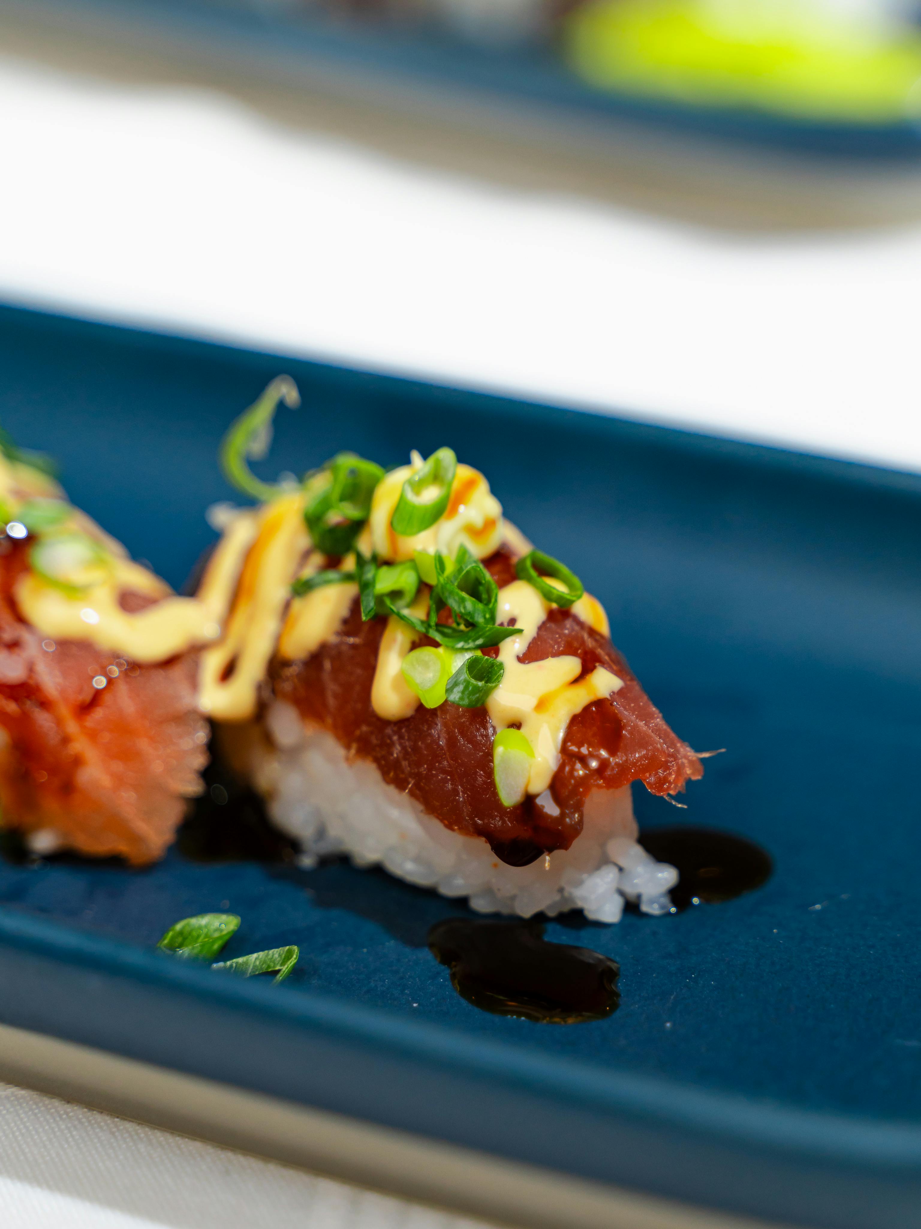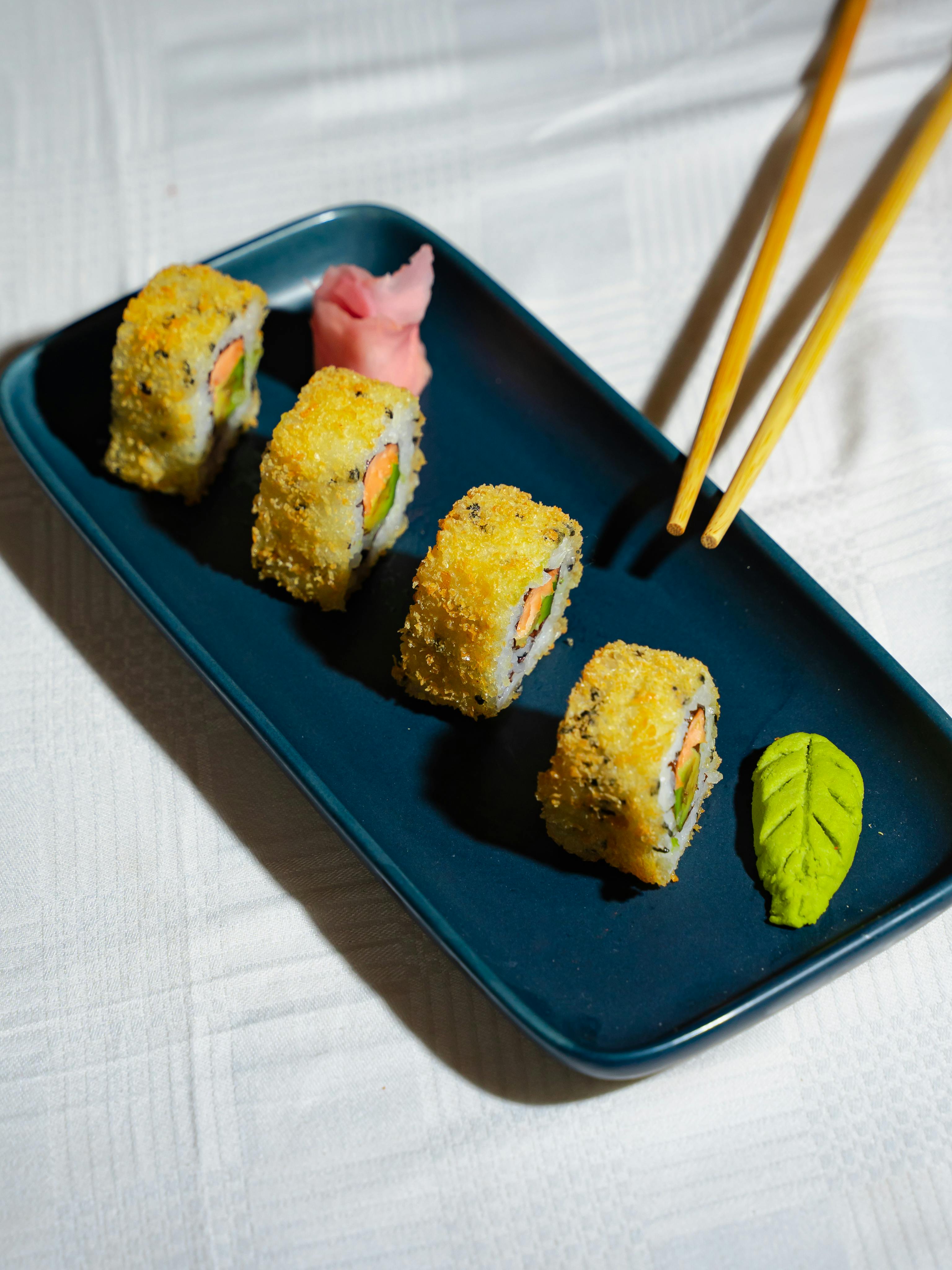 Cream Cheese Smoked Salmon And Avocado Roll Dressed With Spring Onion, Japanese Mayo, Seven Spices And Teriyaki.