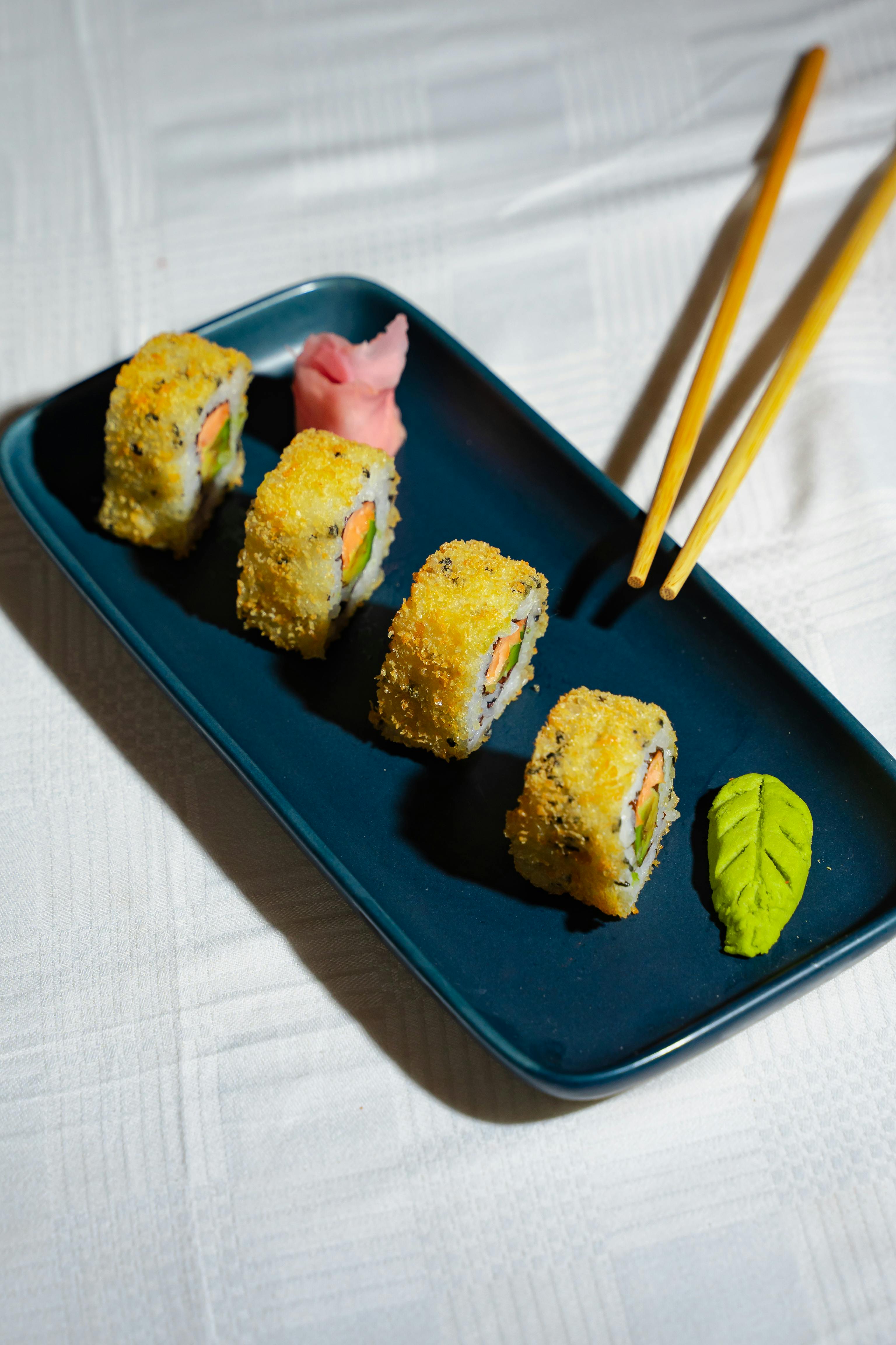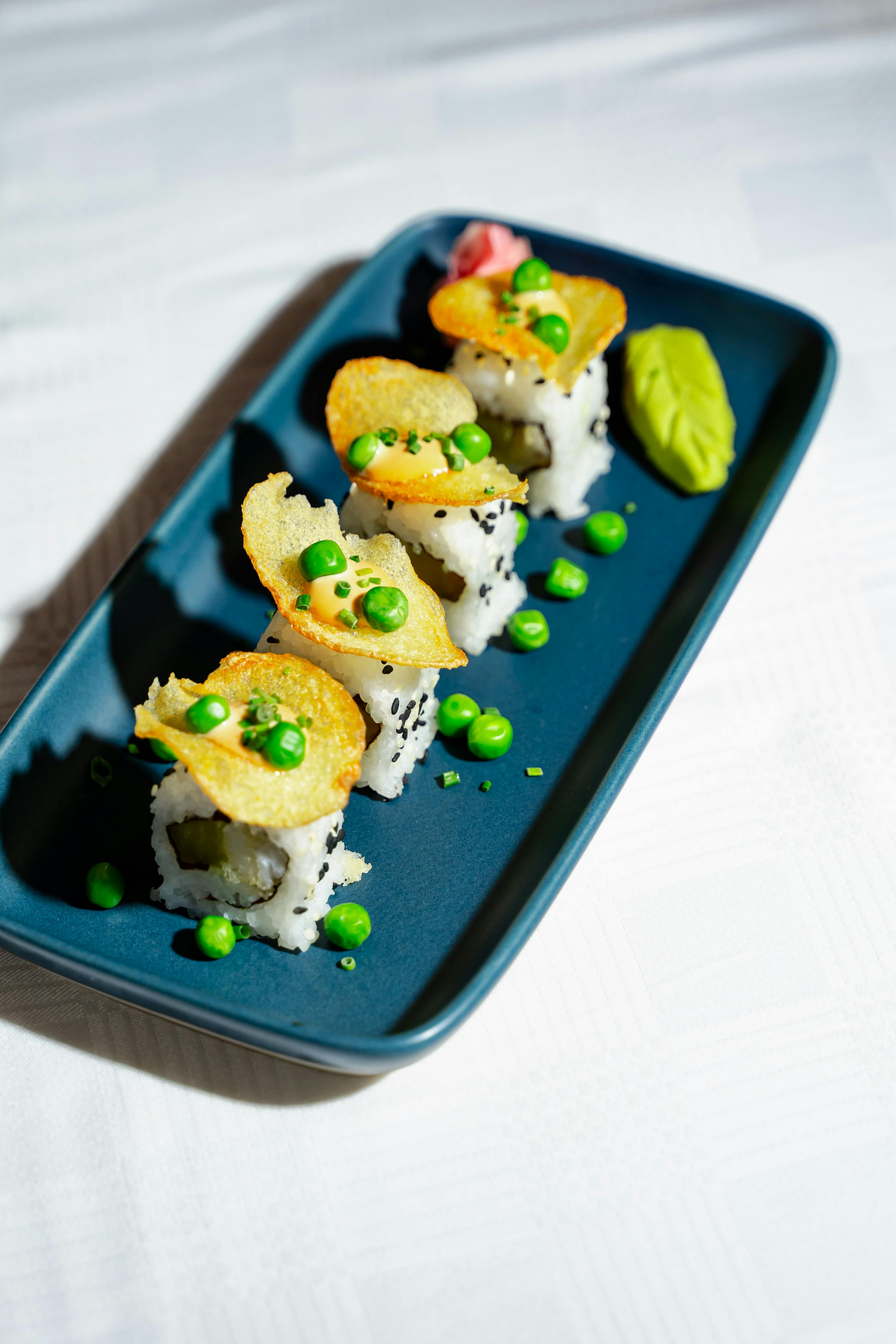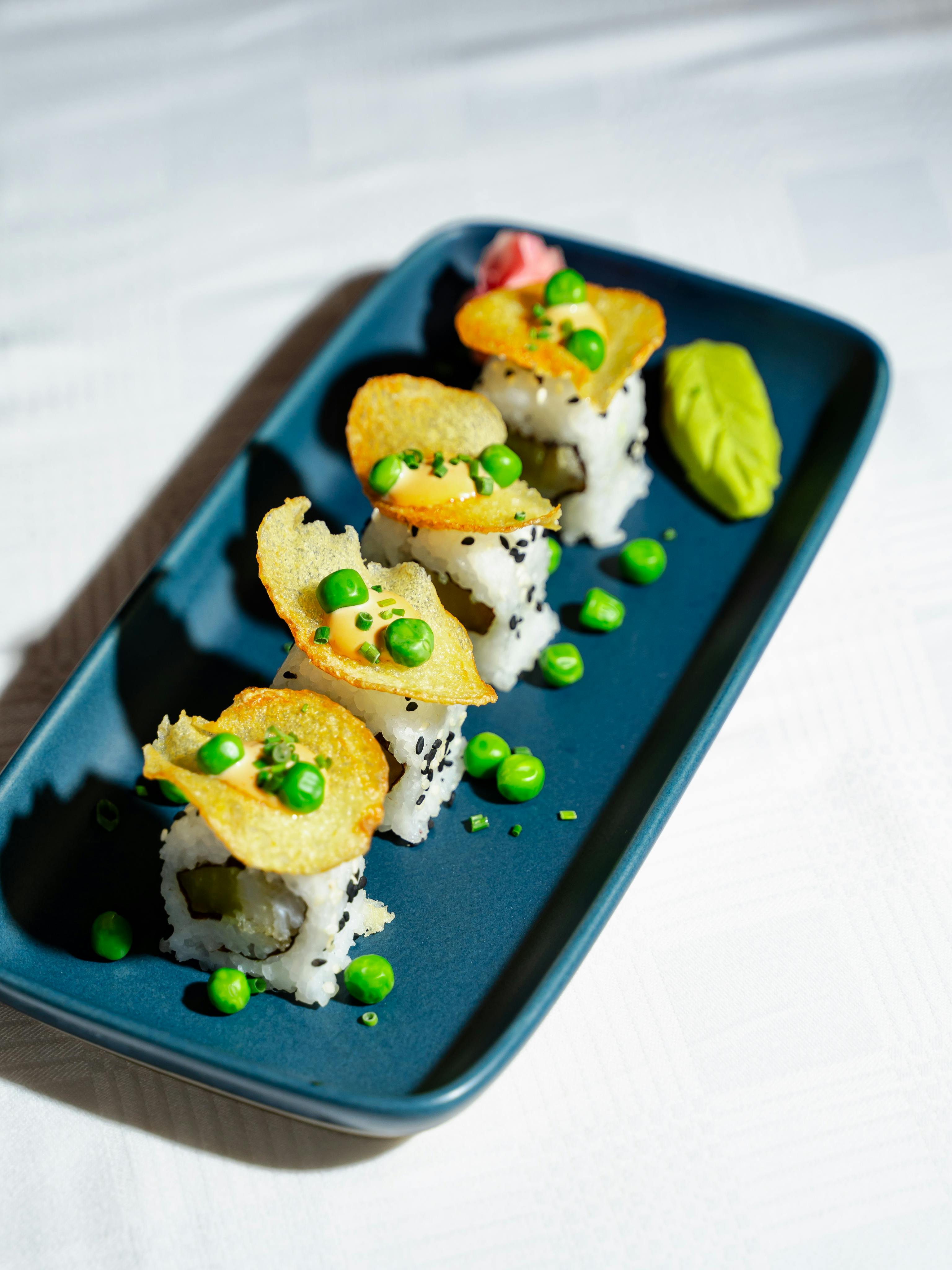 Crispy Hake and pickled radish in an avocado California Roll topped with mini potato crisps, peas, spicy mayo and Teriyaki dressing.