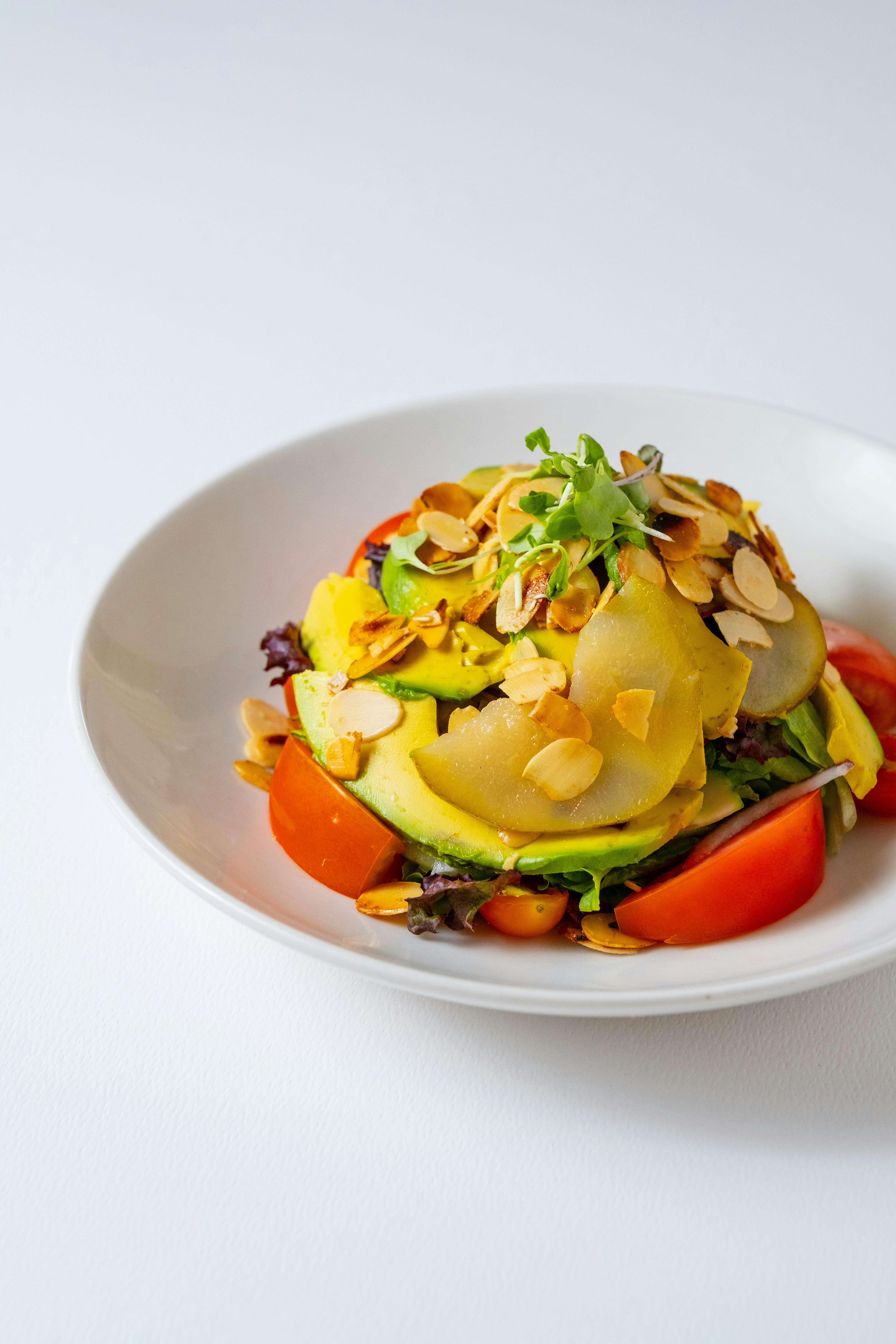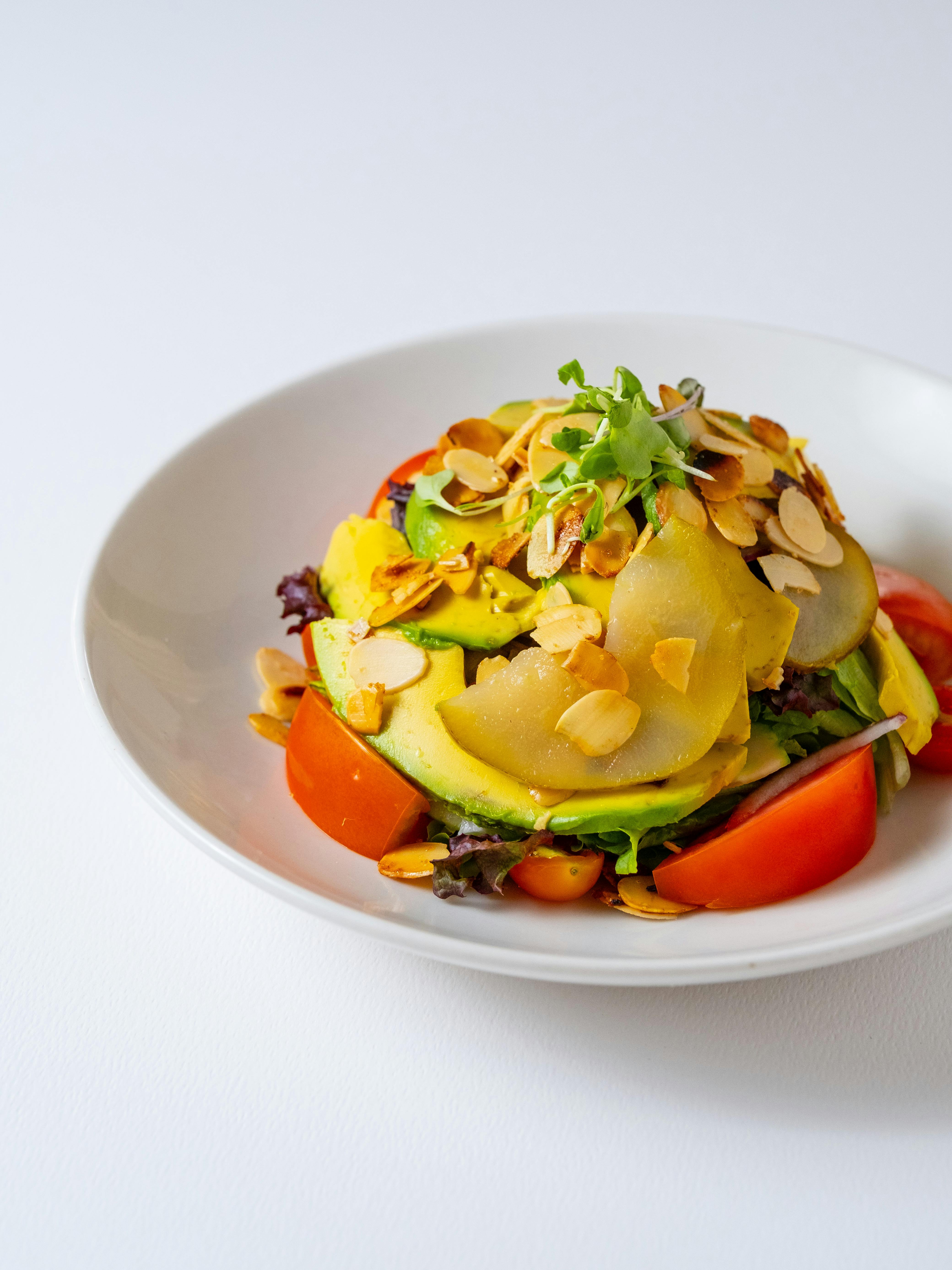 Poached Pear, Caramelized Almonds, Salad Greens, Cucumber, Cocktail Tomato, Served With Grape Salad.