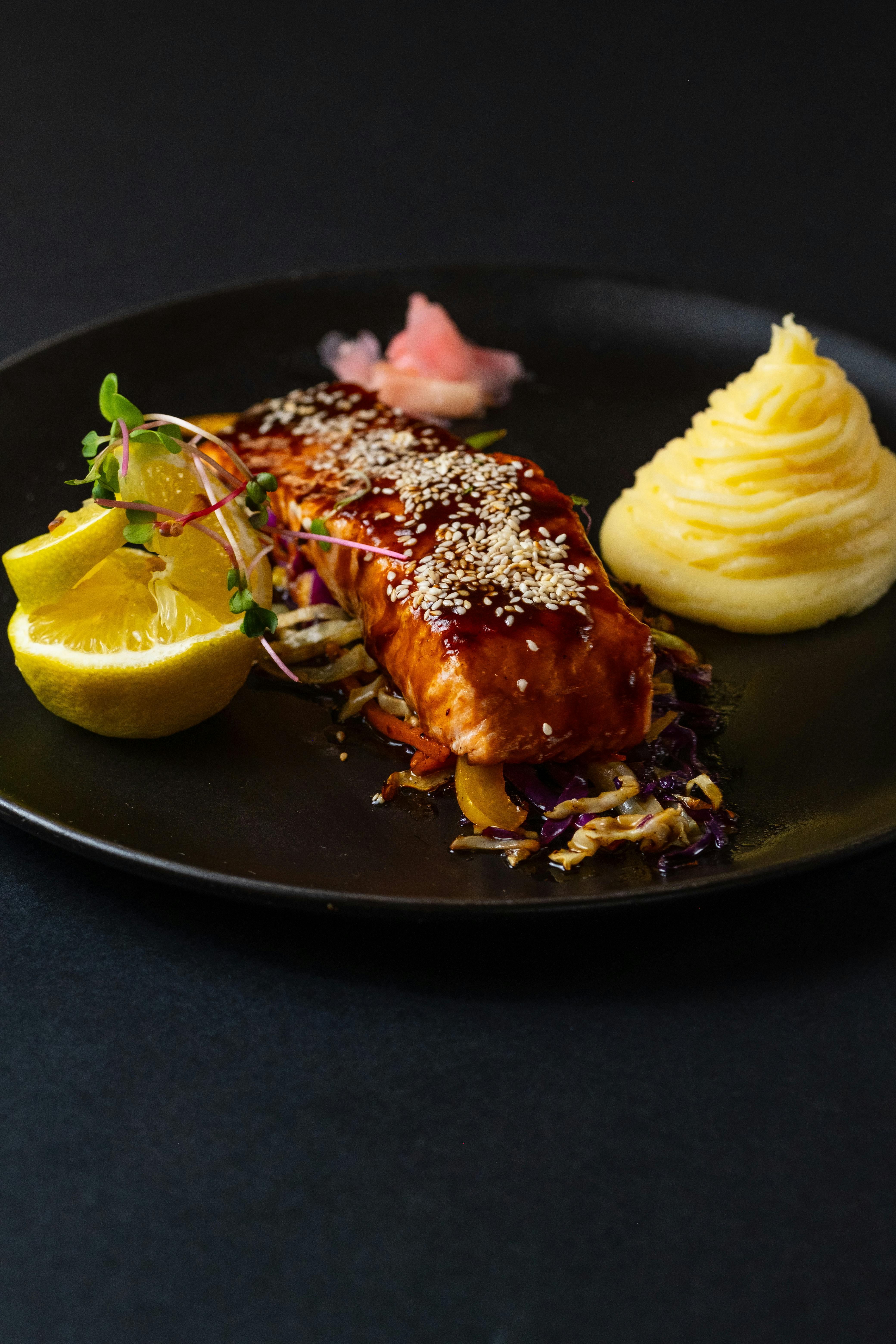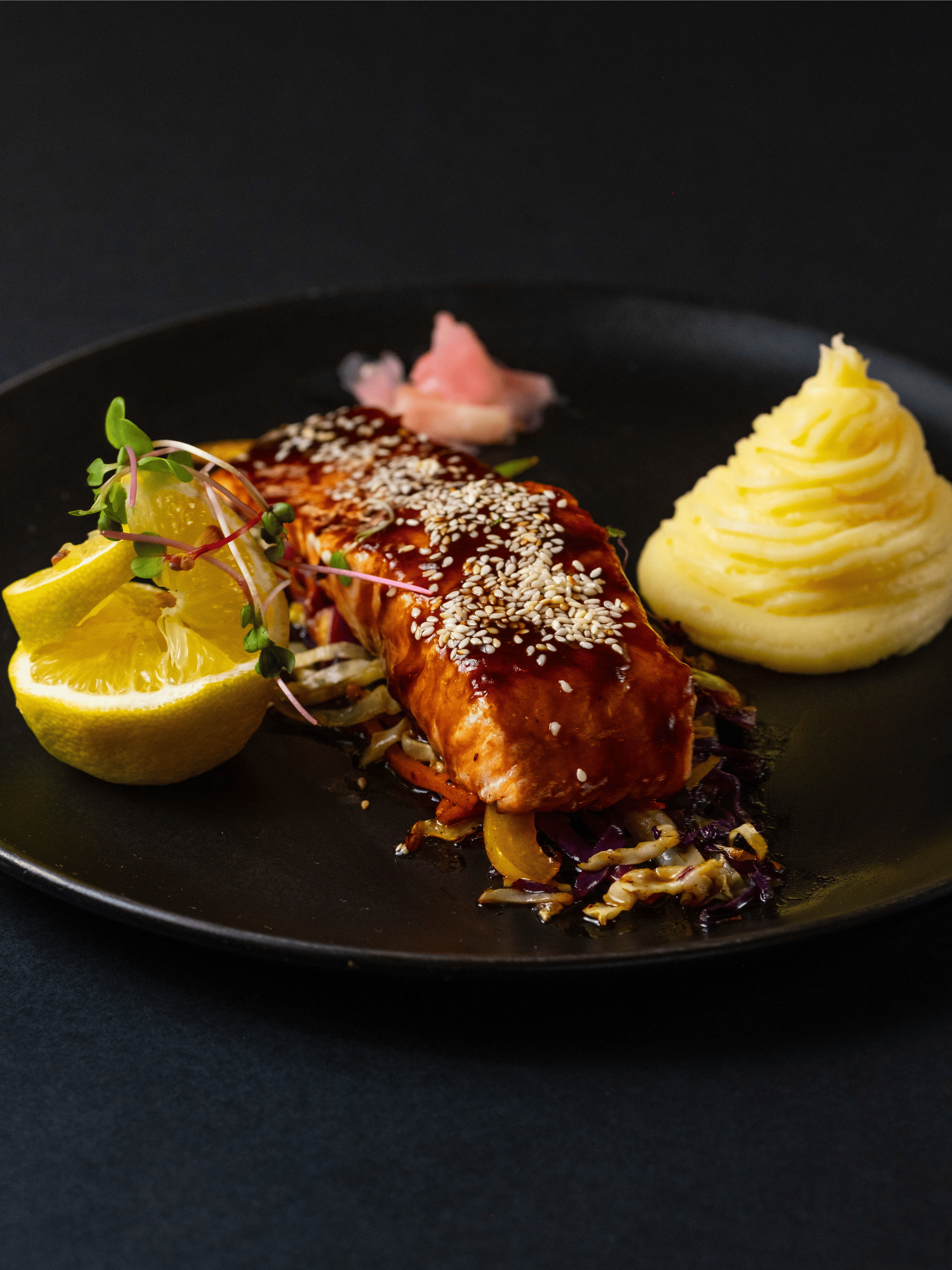 Seared Norwegian Salmon Served With Julienne Veg, Pickled Ginger And Teriyaki Sauce.