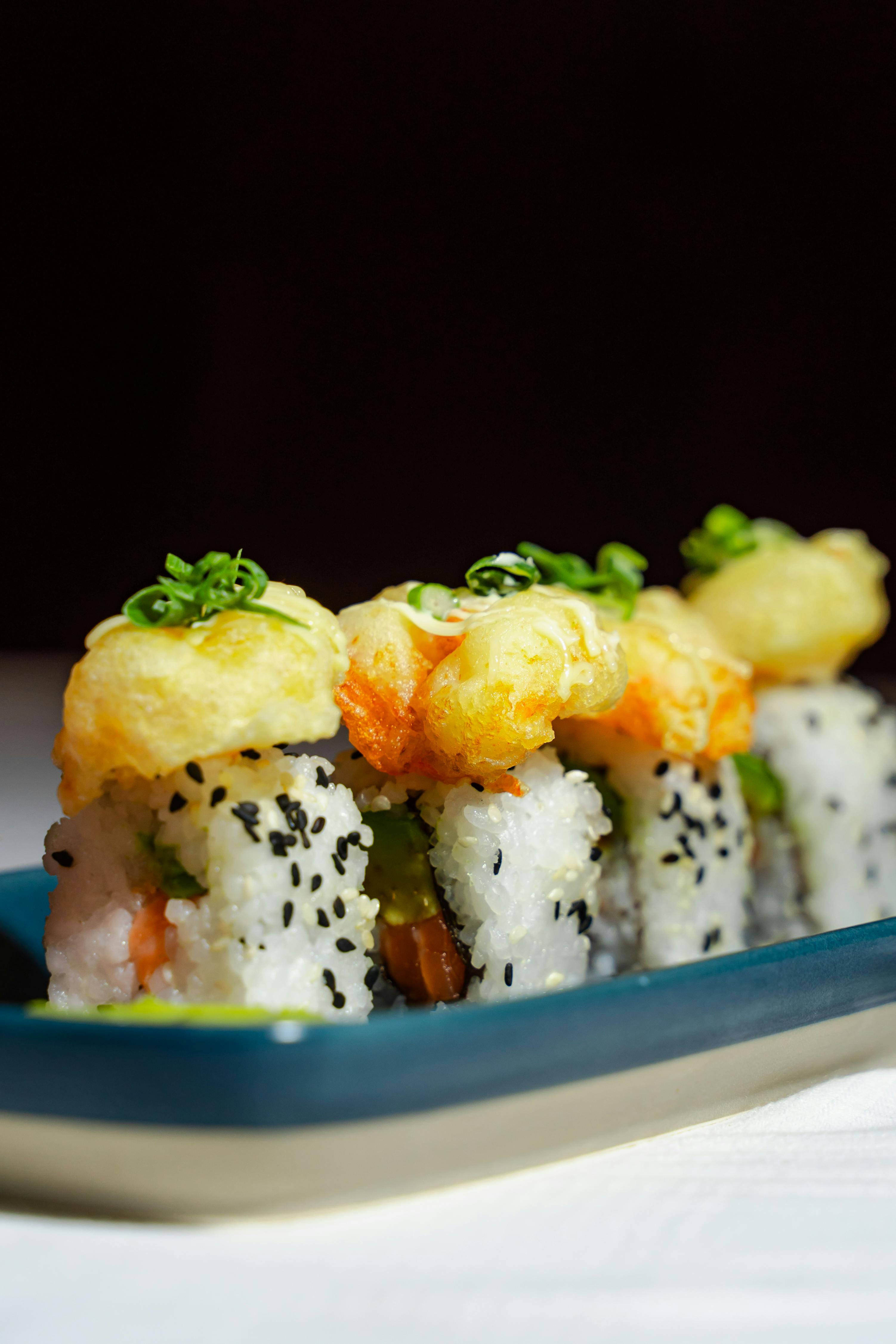 Crispy Shrimp Tempura On A Salmon California Roll Dressed With Creamy Mayo.